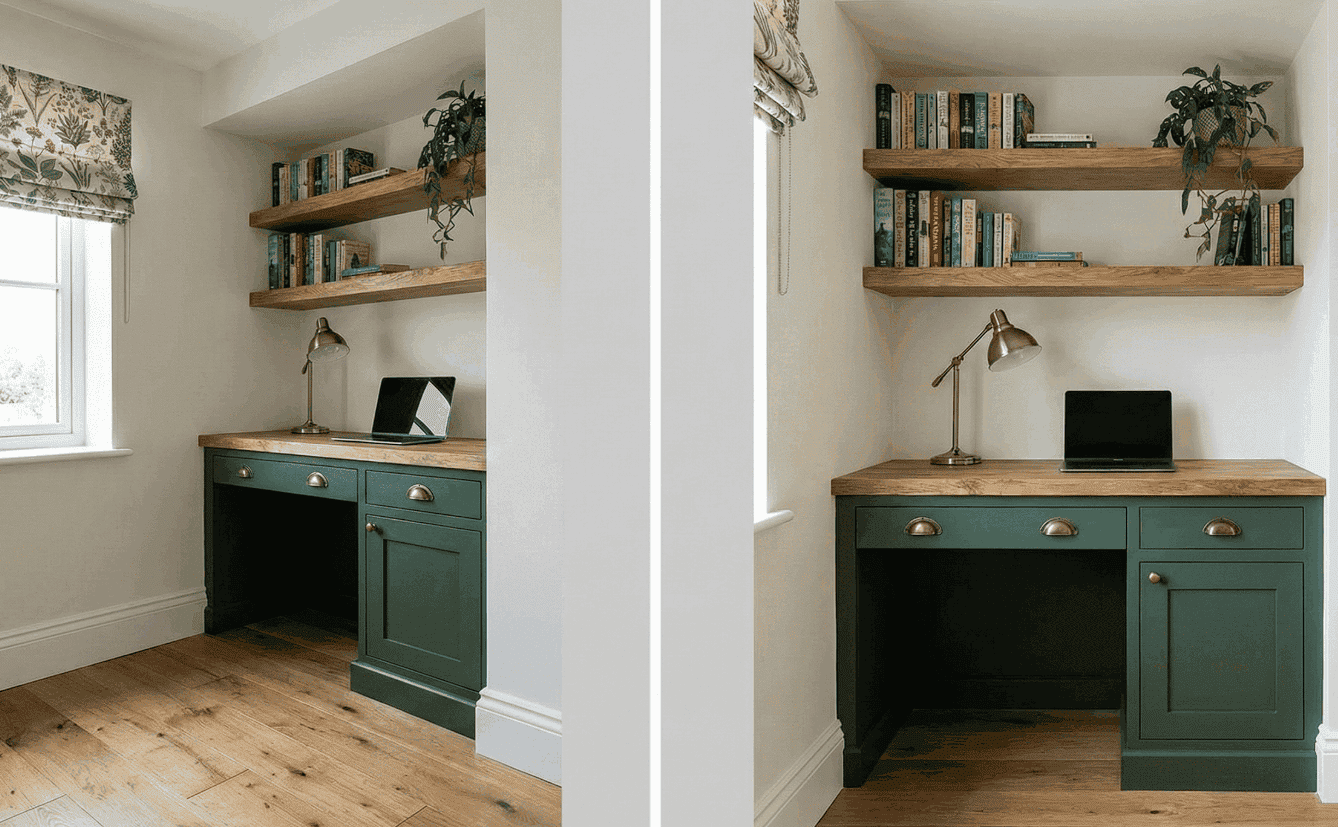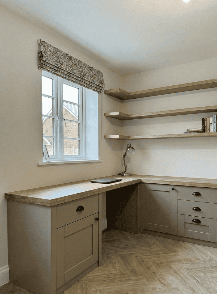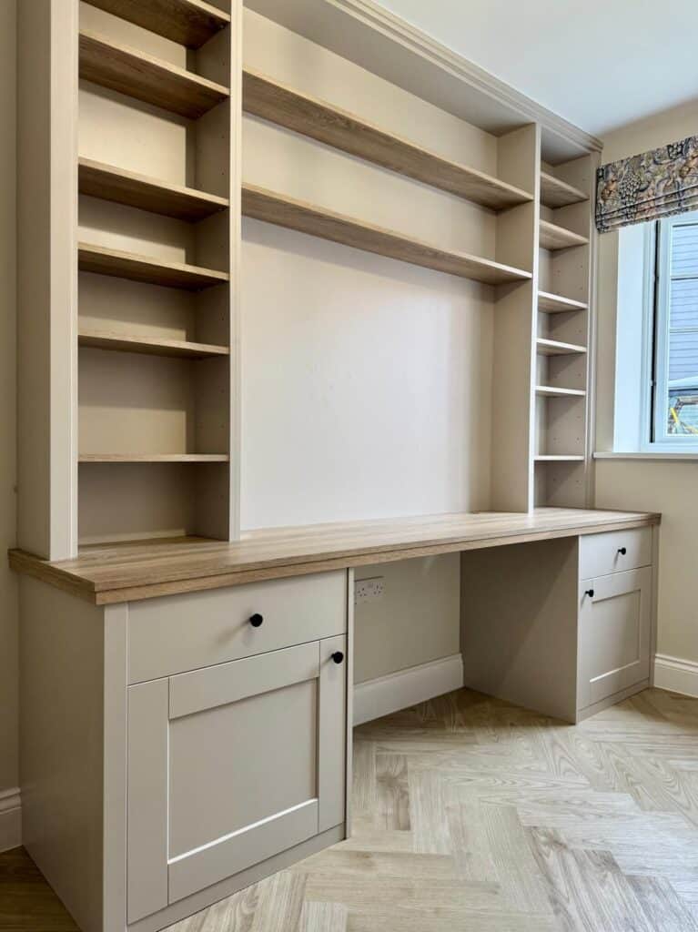 Our bespoke service focuses on solving the unique challenges of your home office, from awkward room shapes to specific storage needs. We don’t use off-the-shelf components; every unit is manufactured in our Suffolk workshop to your exact dimensions and specification.